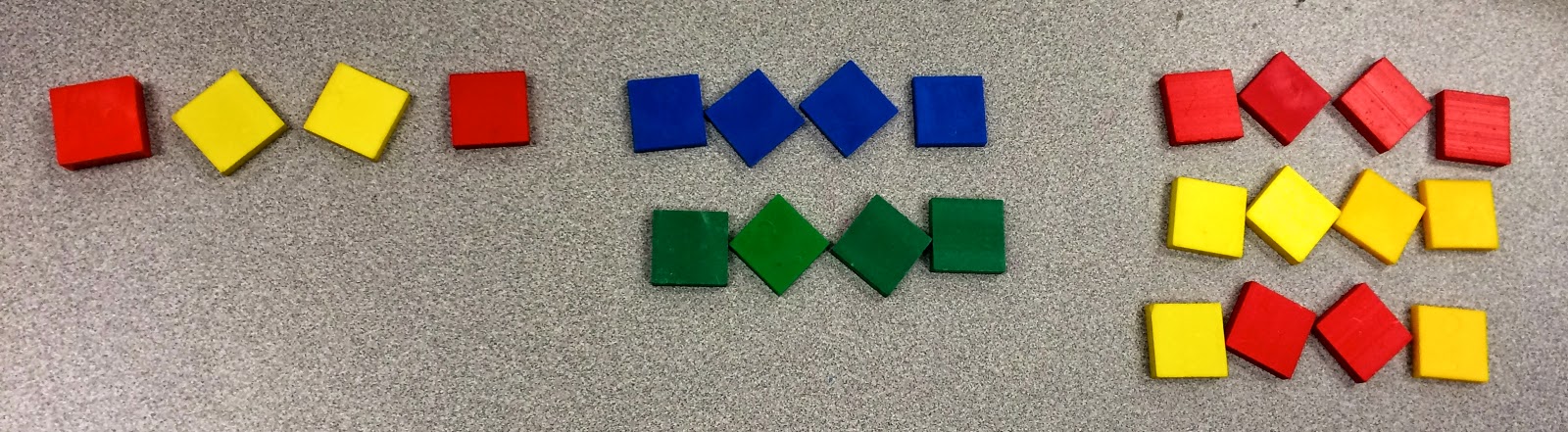 This week we are working on growing patterns in math. We began the concept by using manipulatives. Here are a few of the patterns we worked on today:
